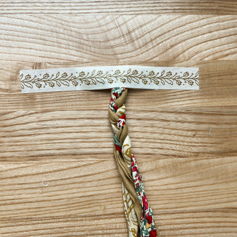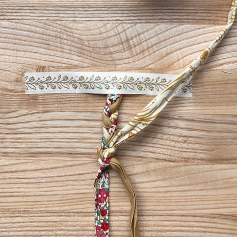 Next take one strip of fabric, poke it up through your braid from underneath, and pull it tight.