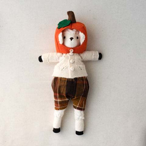 One autumn afternoon, Arthur Lamb was sitting at the bottom of the Village garden and admiring the pumpkin patch when he had an absolutely wonderful idea. Jumping up on his tip toes, he shouted, âA pumpkin hat for my noggin!â Then he said, âWhoopsie-daisy!â for he had just startled his friend Reginald Fox who was tending the garden. Reginald said it was quite all right, so Arthur scooted off to gather the supplies he would need for his hat. What a perfect project for a cozy fall day!Â