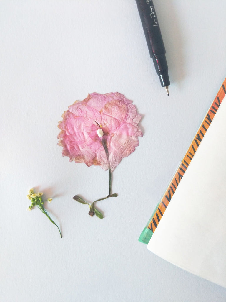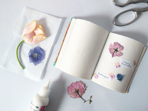 Place a few drops of tacky glue on the back of your flower. Then glue your pressed flower wherever you please.