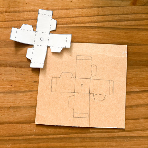 Use the tip of a pencil to poke a small hole through the middle, then glue this piece together on the tabs. It will make a rectangular box shape. We tucked each corner underneath the other to help it stay secure, just like we would do on a big cardboard box.