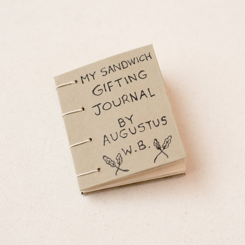 When you have finished stitching the binding, the only step that remains is filling your book with words and pictures. Augustus Wild Boar has been spending a lot of time thinking up sandwich recipes for each of his friends, so naturally he dedicated his handmade journal to the sandwich gifting practice.