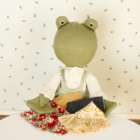 When she is not playing Frog Ball or snacking on waterlily bulbs, Ella Toad can often be found stitching patchwork quilts and new clothes to share with her friends. She always makes sure to save her fabric scraps, just in case she can think of something industrious to do with them. One fine spring morning after her dip in the lake, Ella was perusing her sewing stash when she thought of the perfect project: a braided rag rug!