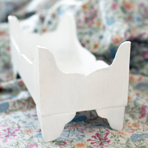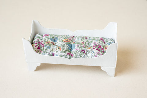 One afternoon not long ago, Juliette returned to her cottage from a productive day of pond-gazing. She looked around her front room – which was relatively tidy aside from her china-painting supplies – and said to herself, “I would like to have a comfy daybed to put under my window. I believe that is just what this space needs.” Juliette pondered how her daybed should look, and decided on a white frame with a wildflower-printed cushion in cool tones. Serene!