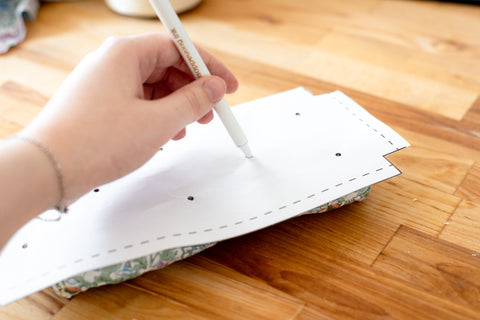 Now it is time to add the tufts, which will elevate this cushion to hitherto unseen levels of splendiferous comfort. Use a pencil to poke through each hole marked on your cushion pattern. Then place the pattern on top of the cushion and mark the location of each hole. The embroidery pen we used will disappear with water – if you are using a regular pen or pencil, make sure to only mark a small dot so that you can hide it with a stitch.