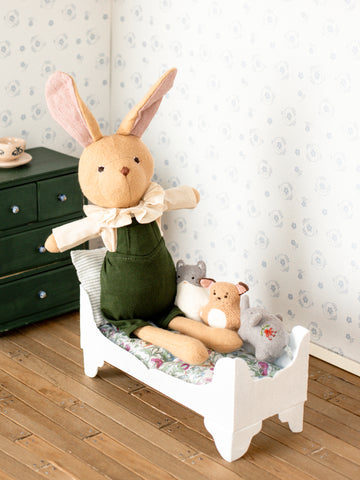 Have you met our friend Juliette Rabbit? Juliette is quite a thoughtful bunny – she likes to gather pine needles from the trees next to her house, and make little pine needle sachet pillows to share with her friends so their laundry can smell fresh and good. Owing to her artistic nature, Juliette also has a finely honed aesthetic sensibility and an appreciation for the eccentric. She can oftentimes be found sitting quietly beside the pond and studying the pond life for inspiration in her china painting. Of course, when Phoebe Fawn skips up and asks if she is game for a round of Frog Ball, Juliette will happily hop to her feet and be just as loud and silly as her other animal friends.